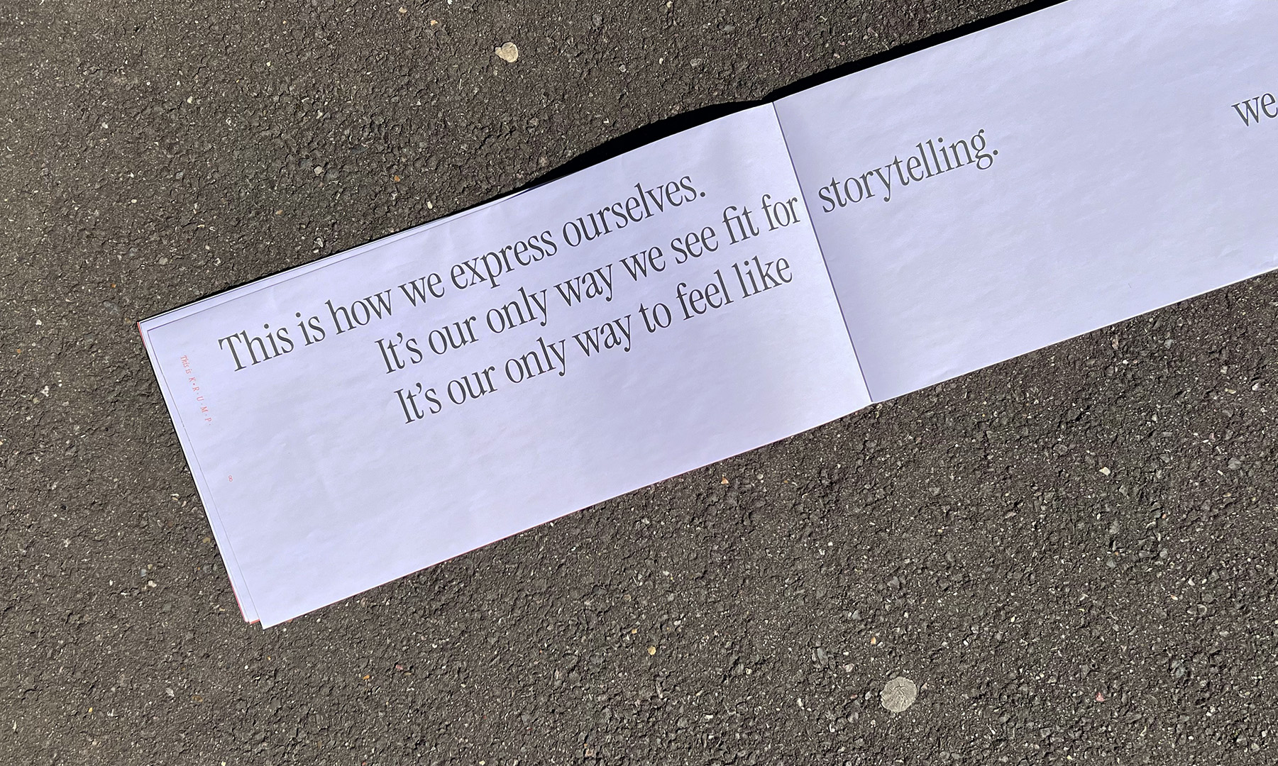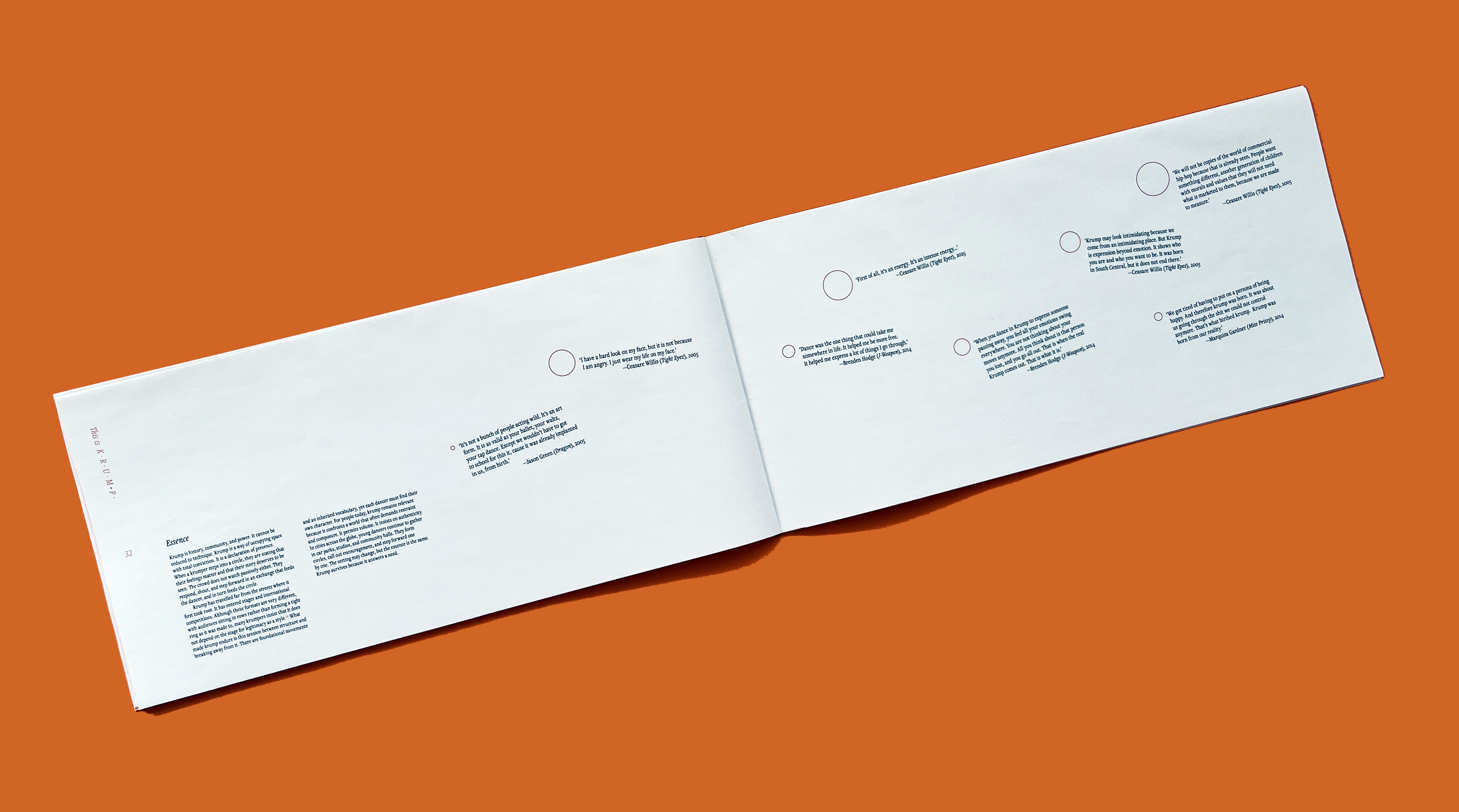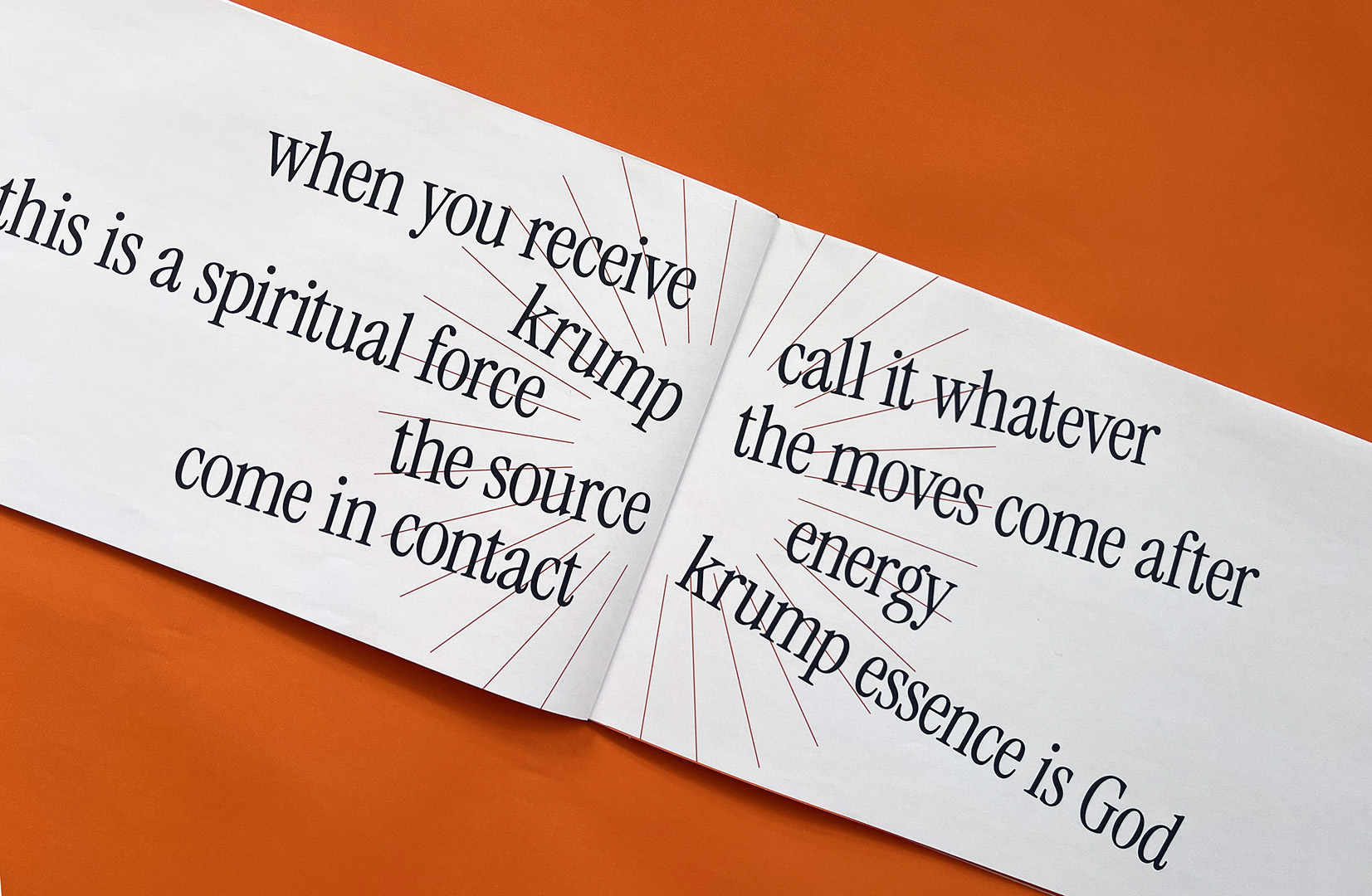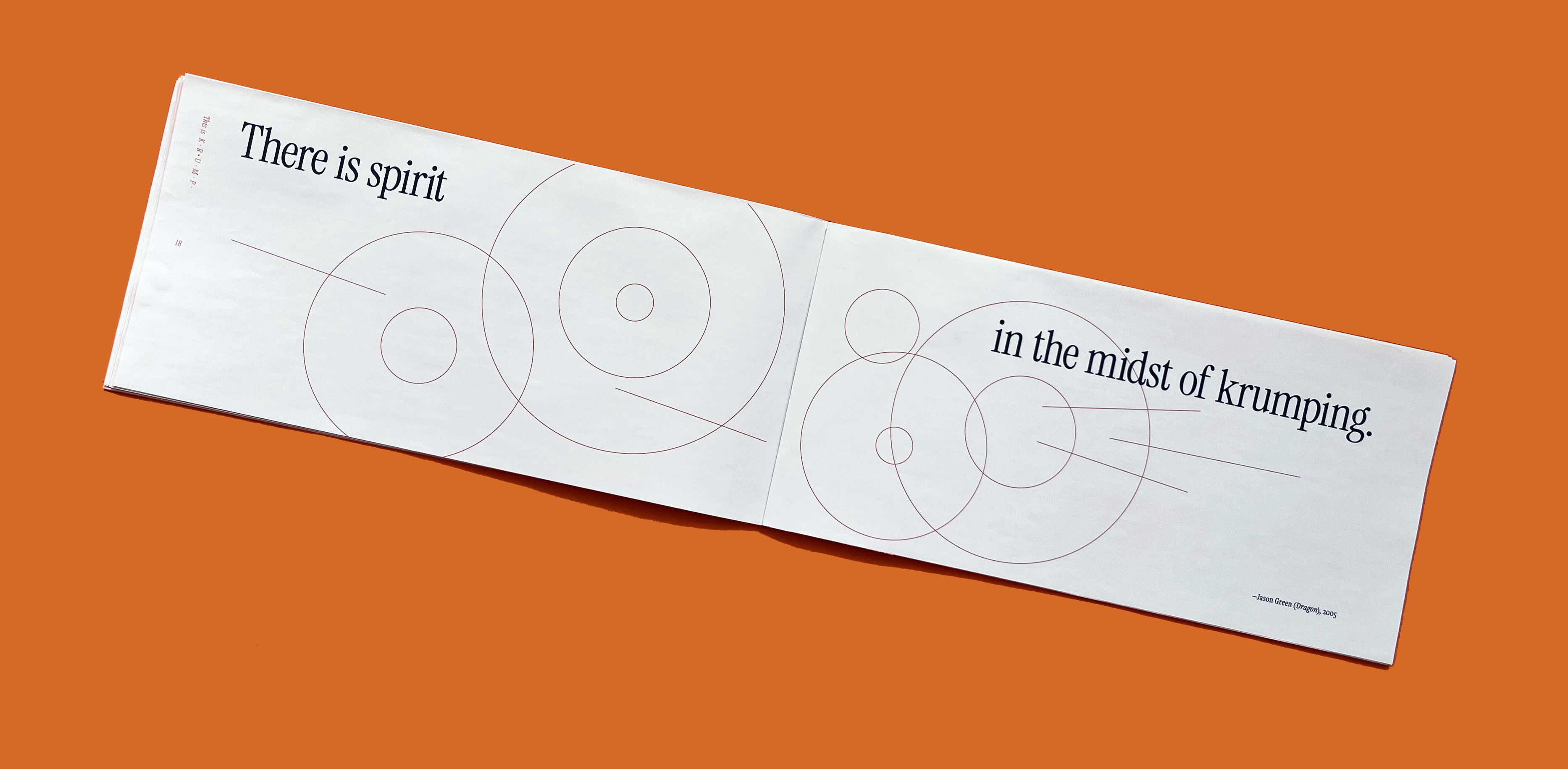 This is a manifesto about the origins and essence of krump, a style of street dance. It is meant to portray power through movement and break stereotypes of how street dance is often visually characterised. I used typography in a systematic way with intentional moments where this is broken to represent the rhythm of the dance. Alongside this submission there is a Specification document outlining every design decision made. This is available upon request.
